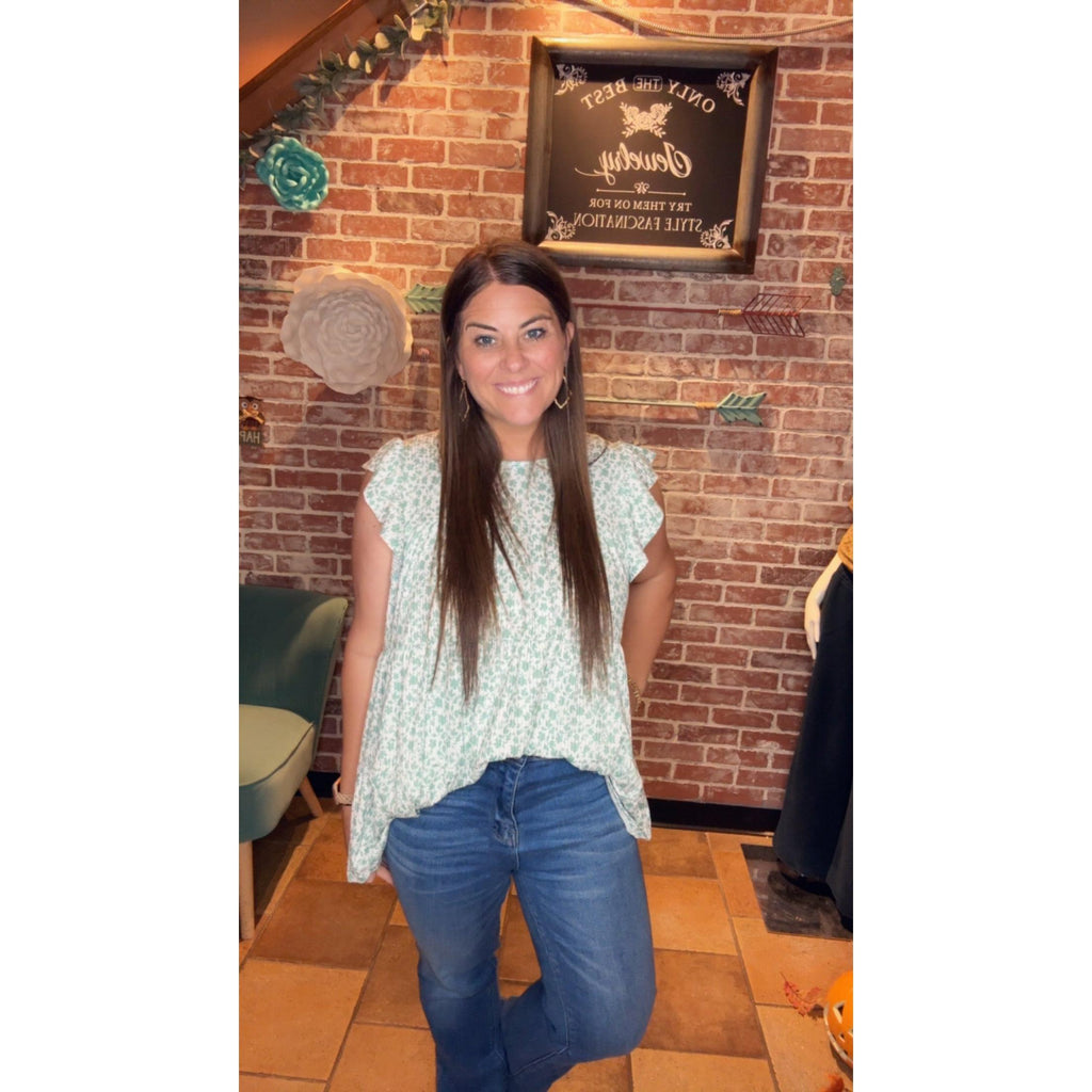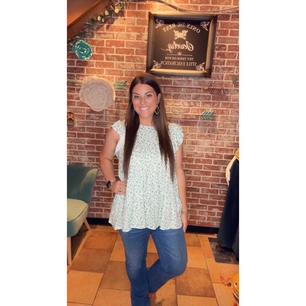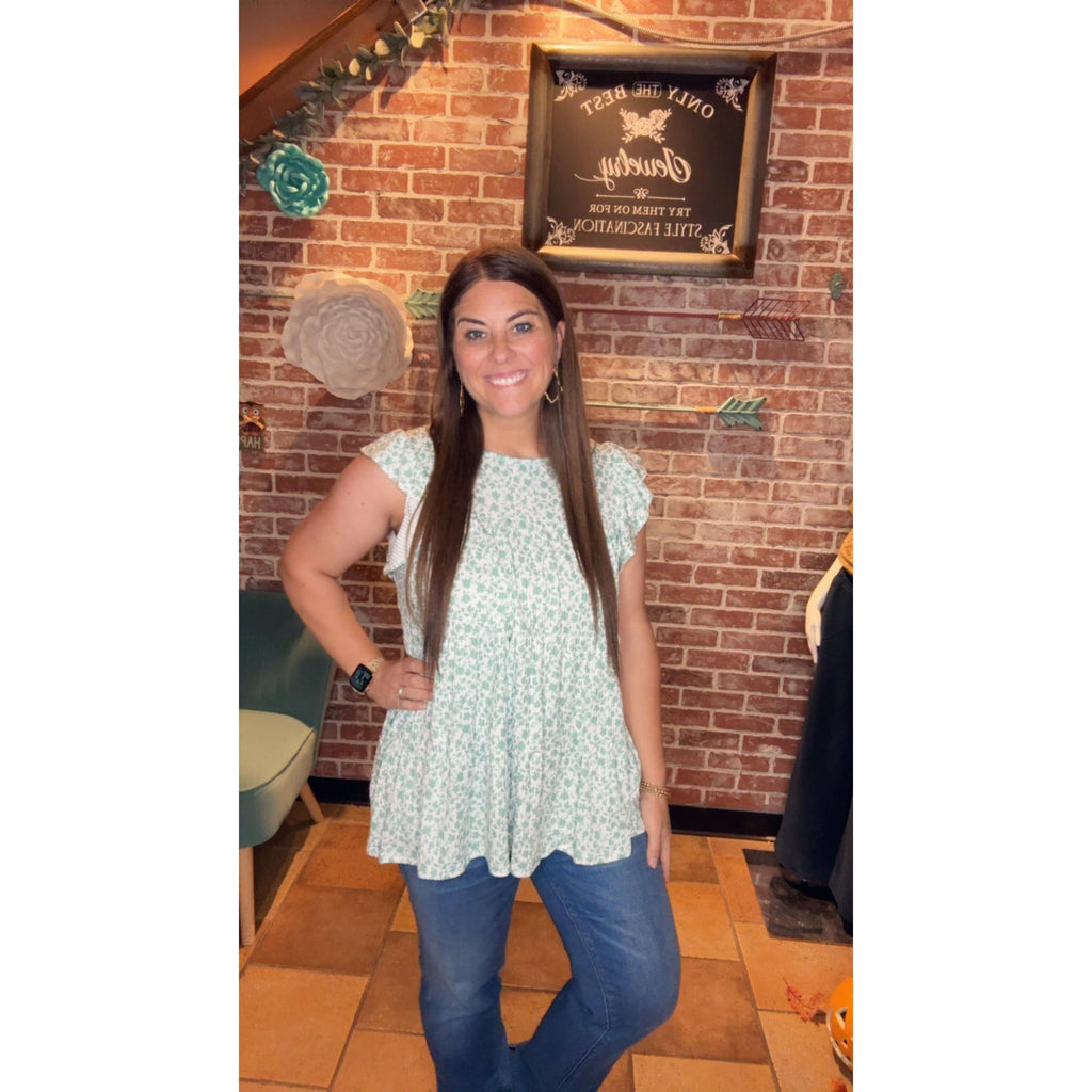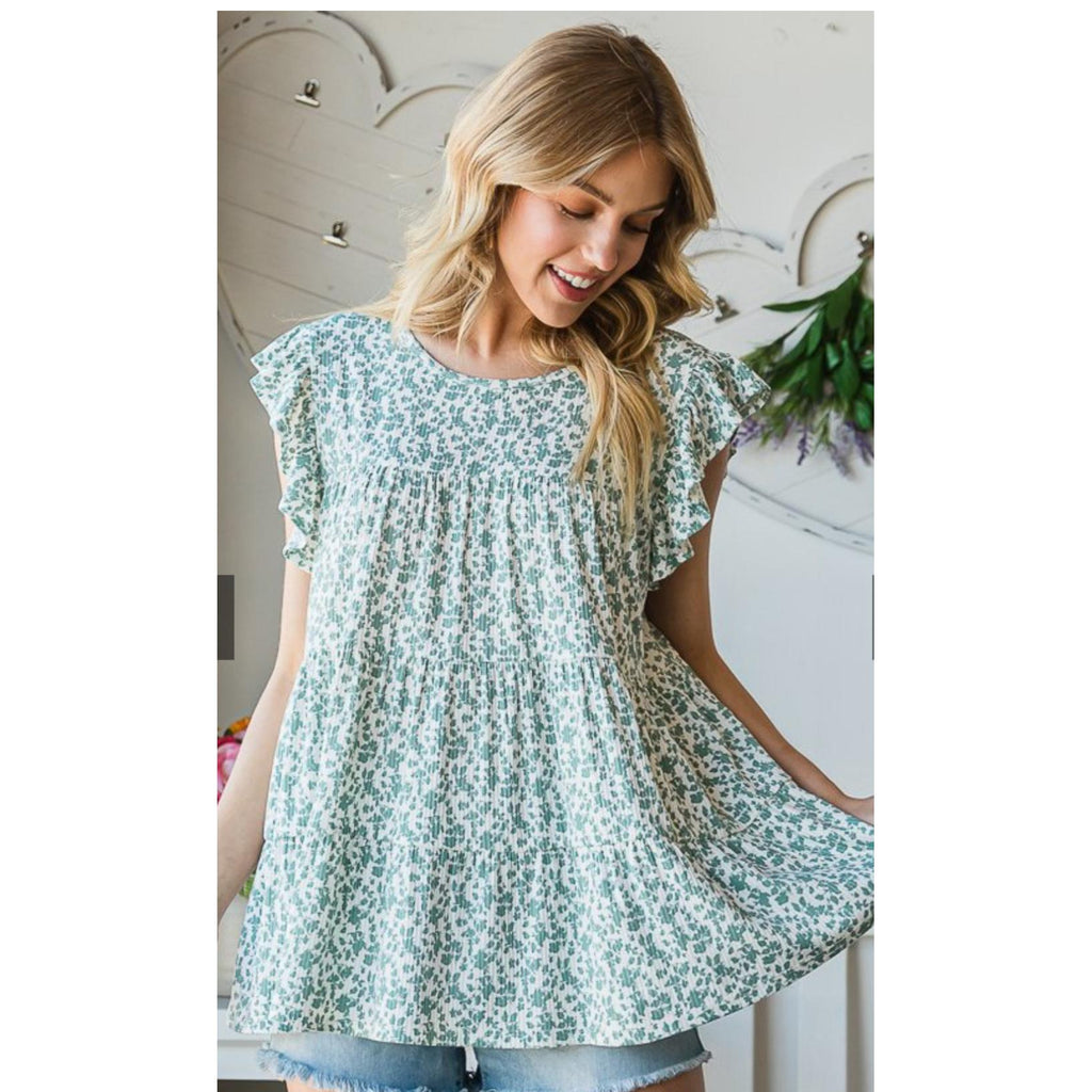 Our Amelia top has a sage floral print tiered top with butterfly short sleeves. It is the perfect top for the summer and fall. You can pair it with cut of shorts or rolled up jeans and sandals for and ideal look.
