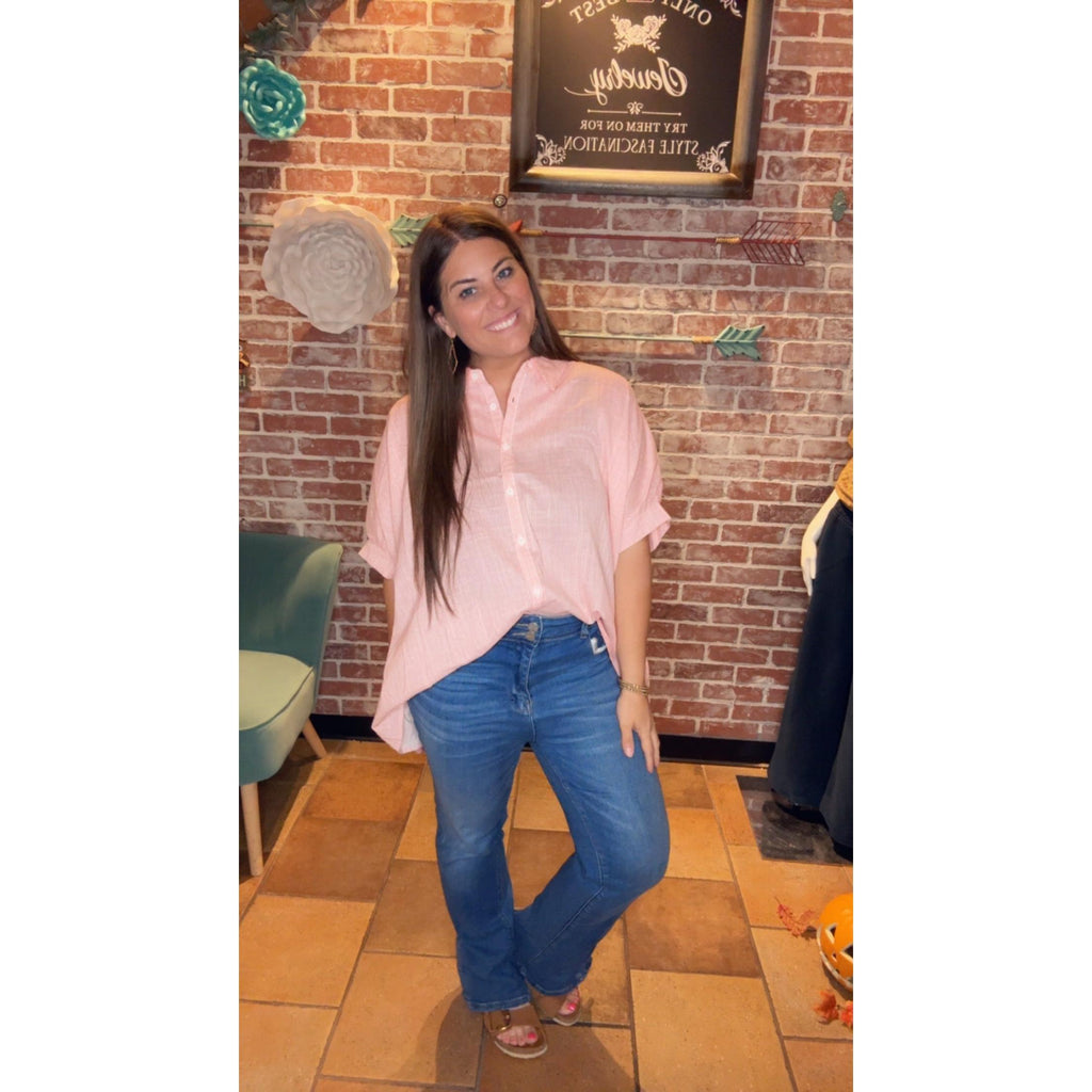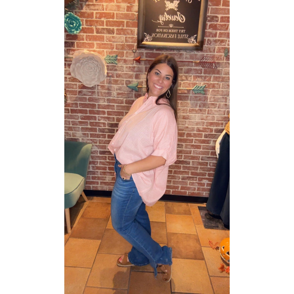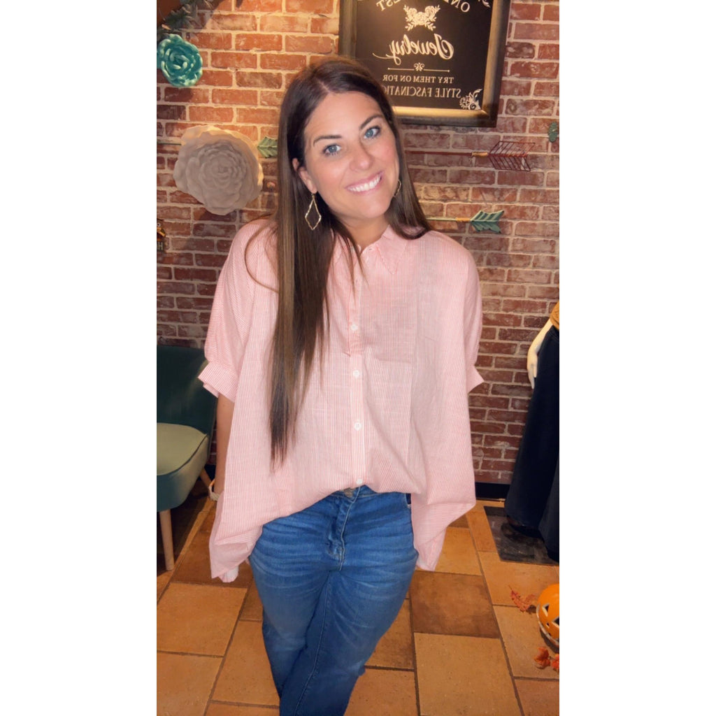 Our Kasi top will be the perfect addition to your closet this spring. You can wear it in a front tuck with your distressed jeans or white shorts. It is oversized so you might want to size down.