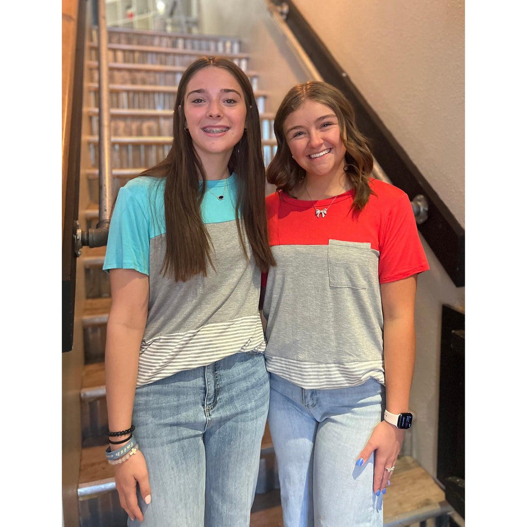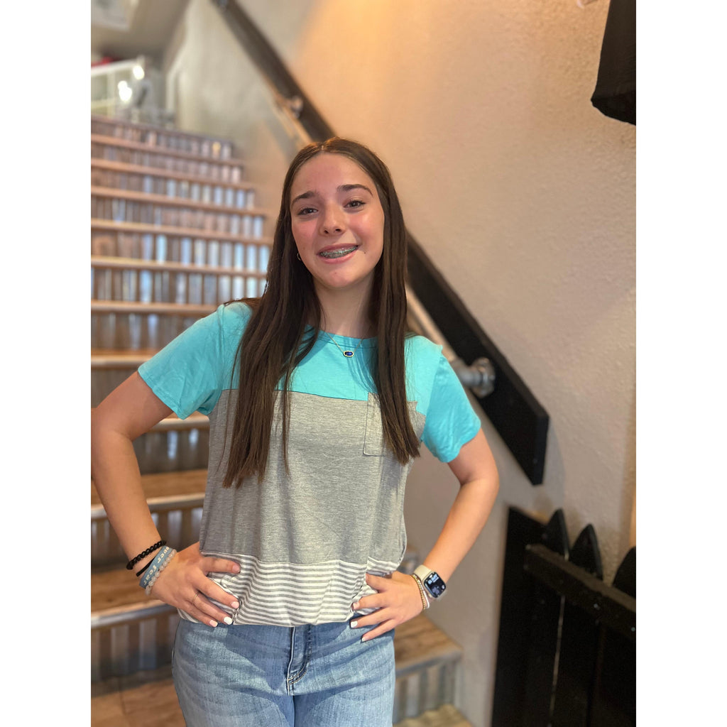 Our Diane top is a classic top with a round neck detail and a pocket in the front. It features 3 different material that makes it unique!