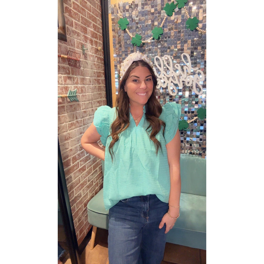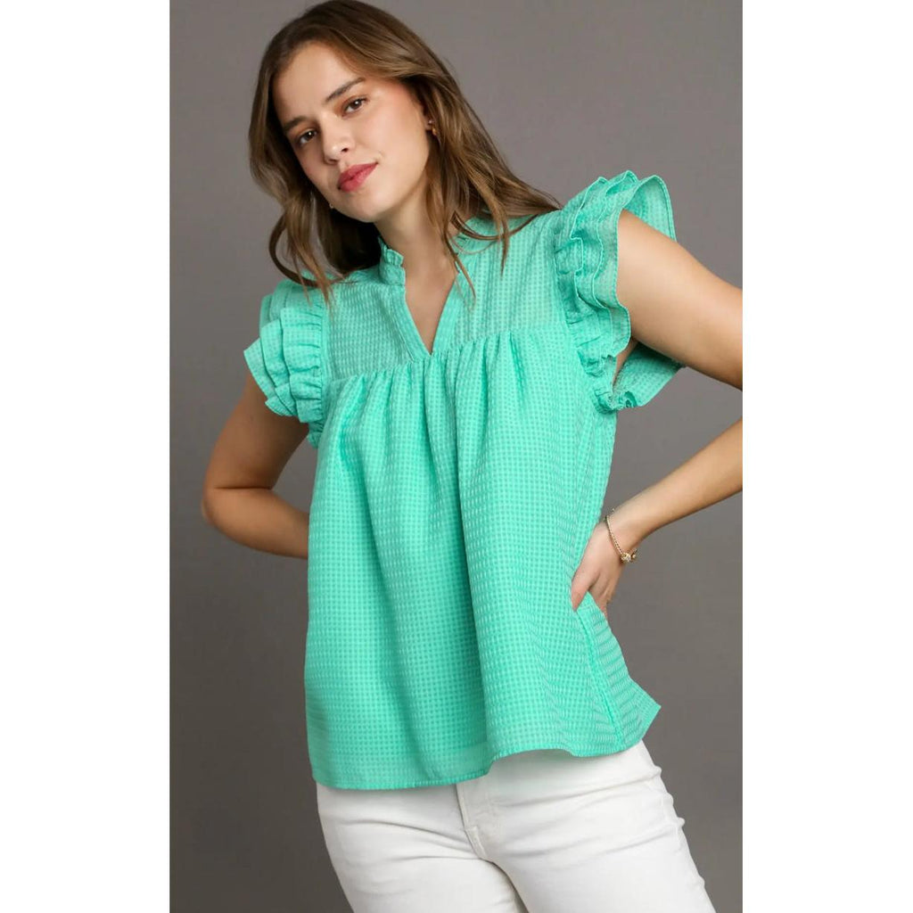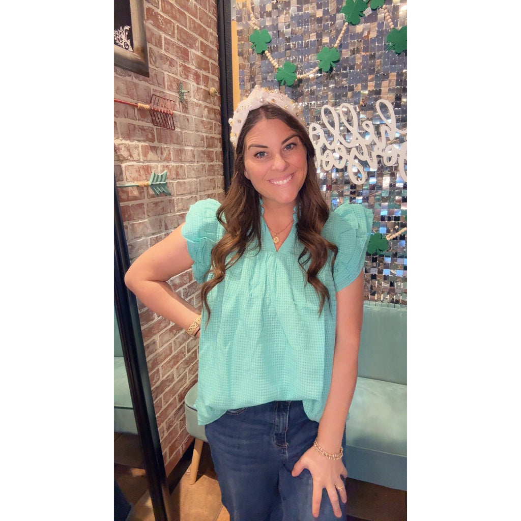 Our Stesha top is a beautiful organza layered ruffle sleeve split neck top with a ruffle hem neckline. It comes in both red and emerald. It is the perfect transition piece for this spring!! You can pair it with a pair a jeans or cutoff shorts easily. Throw some cute jewelry on and you can dress it up for date night or a casual day at the office.