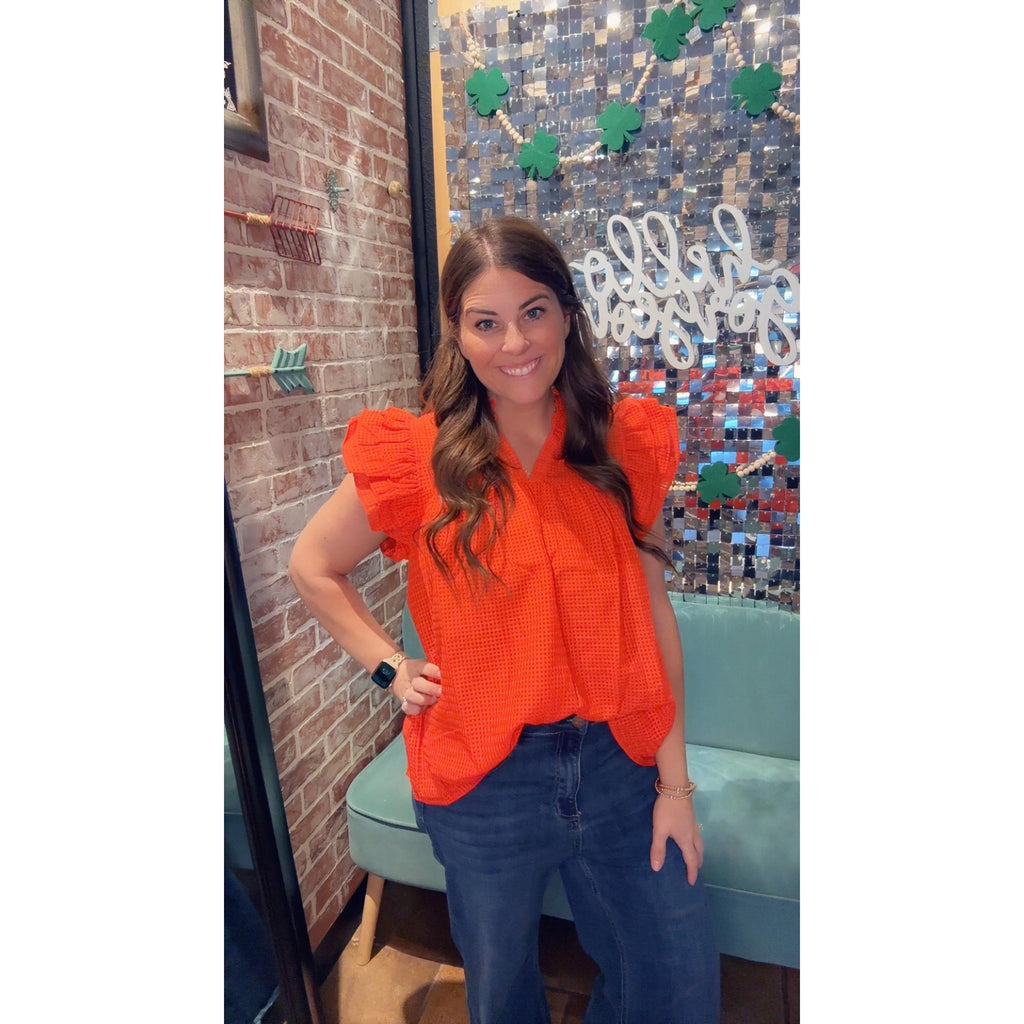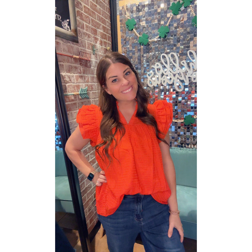 Our Stesha top is a beautiful organza layered ruffle sleeve split neck top with a ruffle hem neckline. It comes in both red and emerald. It is the perfect transition piece for this spring!! You can pair it with a pair a jeans or cutoff shorts easily. Throw some cute jewelry on and you can dress it up for date night or a casual day at the office.